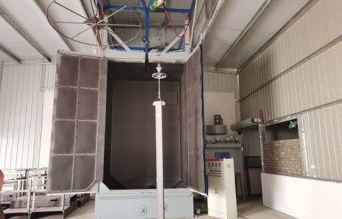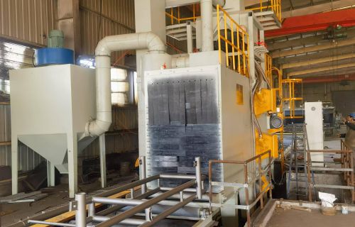 【現(xiàn)場安裝圖集】:簡介:吊鉤式拋丸機分為單吊鉤和雙吊鉤,拋丸機由吊鉤裝載工件交替進入拋丸清理室內。利用拋...